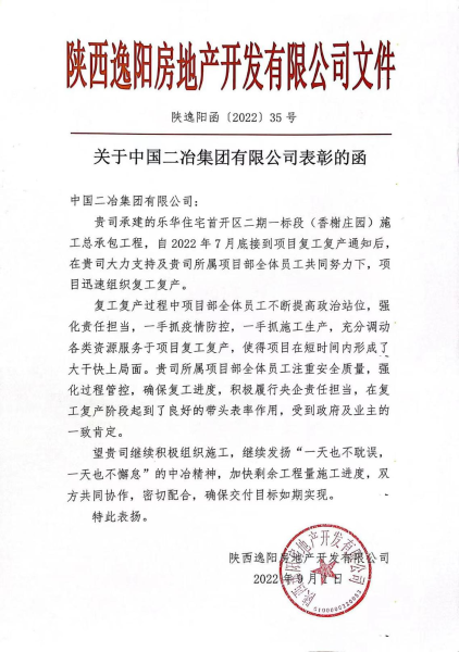 9月1日,中國二冶收到陜西逸陽房地產(chǎn)開發(fā)有限公司發(fā)來的《關(guān)于中國二冶集團有限公司表彰的函》。表彰函充分肯定了中國二冶陜西分公司在樂華住宅首開區(qū)二期一標(biāo)段(香榭莊園)施工總承包項目復(fù)工復(fù)產(chǎn)以來展現(xiàn)出來的關(guān)鍵時刻頂?shù)米。щy面前勇攀登的央企風(fēng)范。