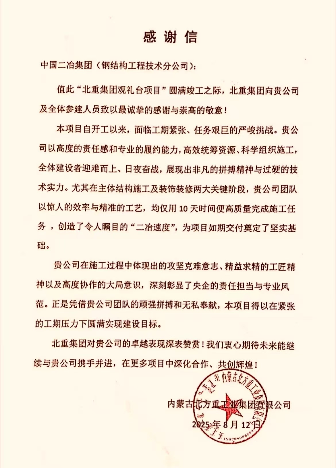 信中最后,內(nèi)蒙古北方重工業(yè)集團有限公司再次對中國二冶及項目部全體人員對項目的辛勤付出表示真誠的感謝,并期待未來與中國二冶攜手并進,共創(chuàng)輝煌!