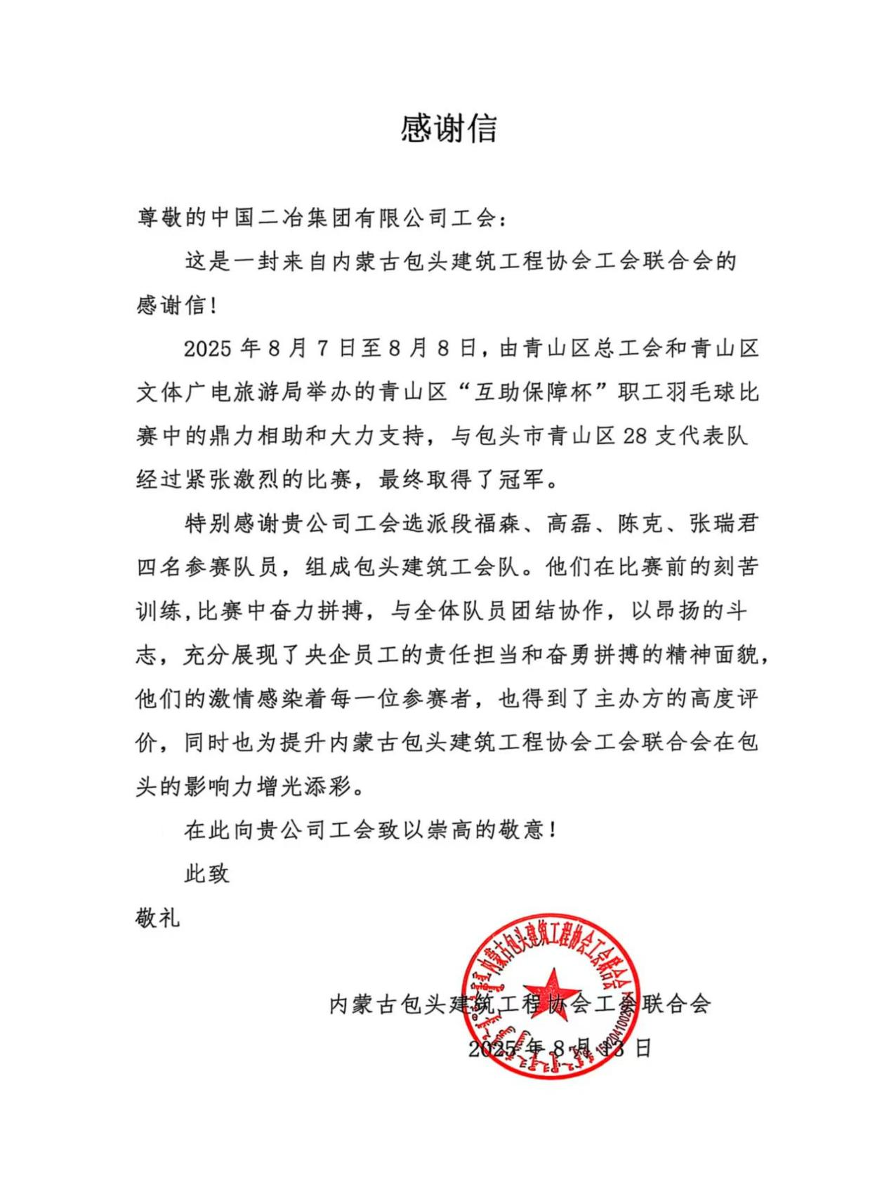 8月13日,內蒙古包頭建筑工程協會向中國二冶工會發來感謝信,對給予協會工作的大力支持表示感謝。