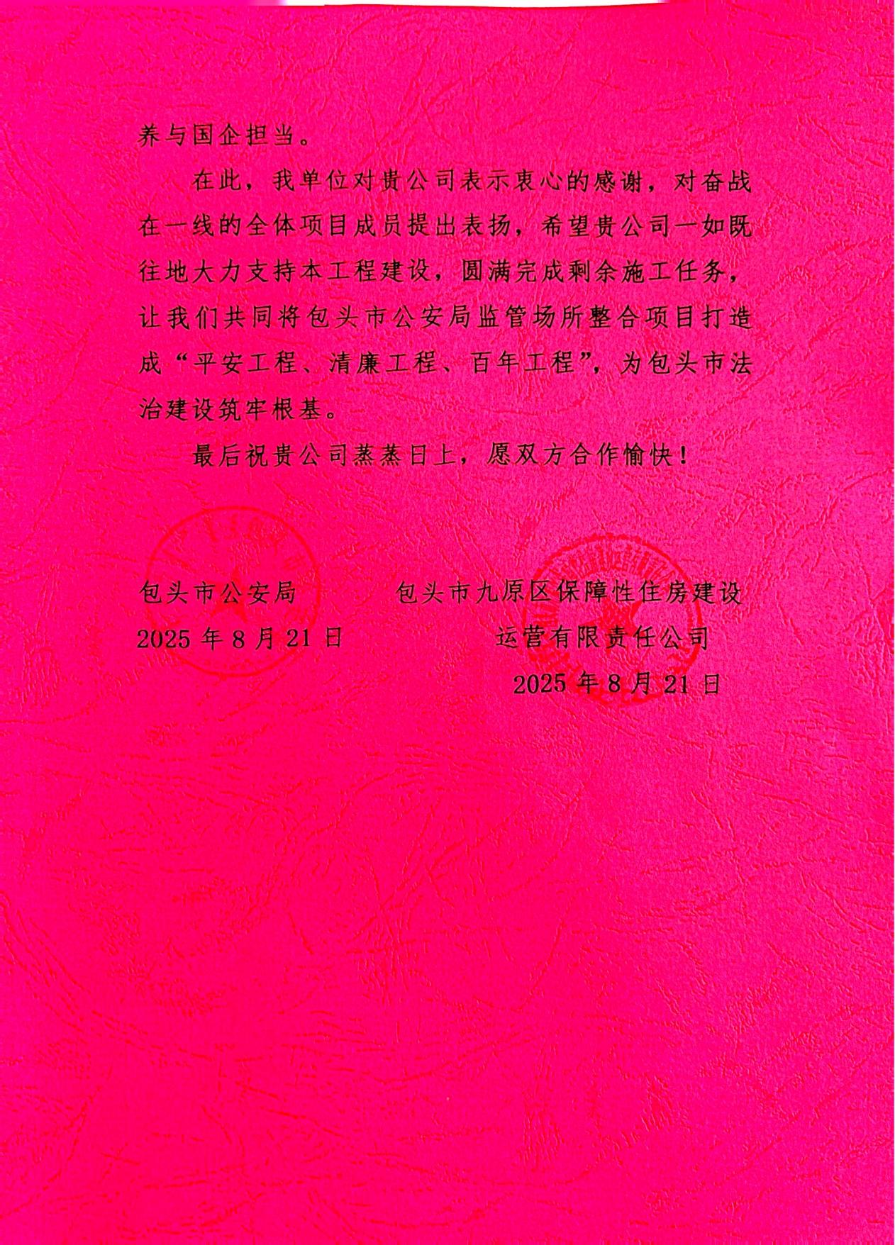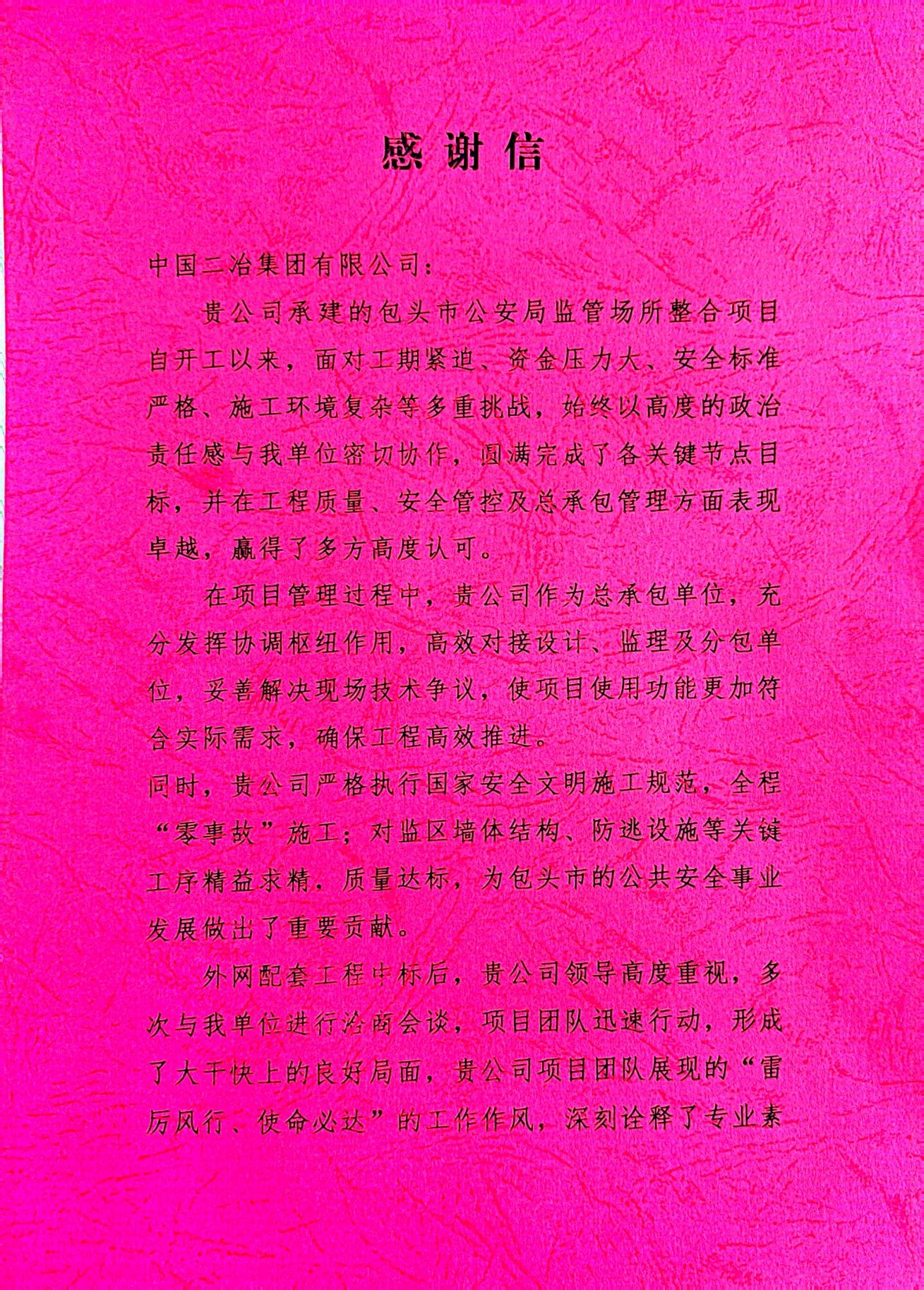 信中指出,貴公司作為總承包單位,充分發(fā)揮協(xié)調(diào)樞紐作用,高效對接設計、監(jiān)理及分包單位,妥善解決現(xiàn)場技術爭議,使項目使用功能更加符合實際需求,確保工程高效推進。同時嚴格執(zhí)行國家安全文明施工規(guī)范,全程“零事故”施工;對監(jiān)區(qū)墻體結(jié)構(gòu)、防逃設施等關鍵工序精益求精,質(zhì)量達標,為包頭市的公共安全事業(yè)發(fā)展做出了重要貢獻。今年,在外網(wǎng)配套工程中標后,貴公司第一時間響應,相關領導高度重視,多次與我單位進行洽商會談,項目團隊迅速行動,人、材、機第一時間到位,形成了大干快上的良好局面,項目團隊展現(xiàn)的 “超越自我、挑戰(zhàn)極限”的作風,以及使命必達的執(zhí)行力,深刻詮釋了專業(yè)素養(yǎng)與國企擔當。