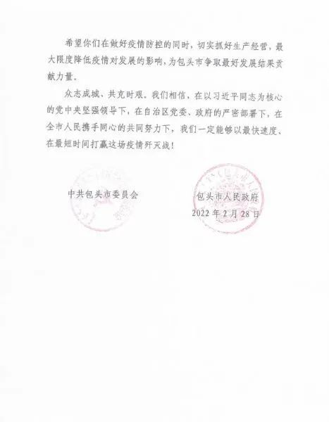 2月23日,中國(guó)二冶向包頭市人民政府遞交了《關(guān)于全力參與我市抗疫阻擊戰(zhàn)的請(qǐng)?jiān)笗?shū)》并表示,作為駐包建筑央企,中國(guó)二冶在做好自身防疫,統(tǒng)籌生產(chǎn)經(jīng)營(yíng),保持經(jīng)濟(jì)穩(wěn)增長(zhǎng)的同時(shí),誠(chéng)愿積極響應(yīng)市委市政府號(hào)召,勇?lián)姑瑳_鋒在前,主動(dòng)參與到各項(xiàng)疫情防控重點(diǎn)工作中。如市政府有緊急抗疫任務(wù),或應(yīng)急設(shè)施建設(shè)任務(wù)。中國(guó)二冶將第一時(shí)間,迅速行動(dòng),調(diào)集駐包單位各方面資源力量,充分發(fā)揮建筑企業(yè)的特點(diǎn)和優(yōu)勢(shì),全力以赴為我市疫情防控貢獻(xiàn)央企力量。