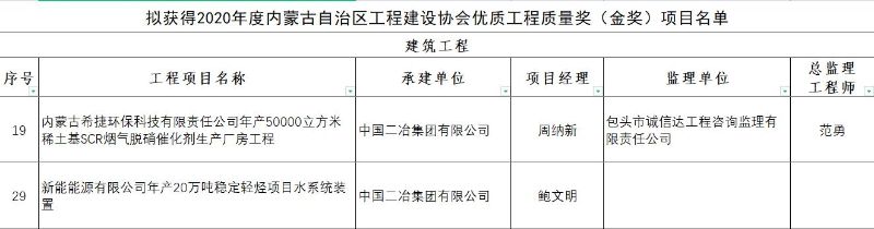 近日,內蒙古自治區工程建設協會公布優質工程質量獎獲獎名單,中國二冶城建分公司內蒙古希捷環??萍加邢挢熑喂灸戤a50000立方米稀土基SCR煙氣脫硝催化劑生產廠房工程、新能能源有限公司年產20萬噸穩定輕烴項目水系統裝置等兩個項目榜上有名。